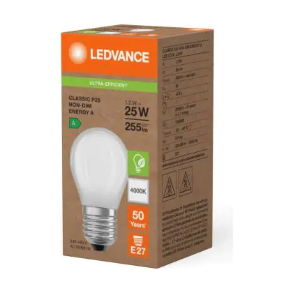 Die Ledvance LED Classic E27 Birne Fadenlampe Matt 1.2W 255lm - 840 Kaltweiß | Ersatz Für 25W ist eine effiziente E27 LED-Lampe mit Retrodesign und der perfekte Ersatz für Ihre konventionellen 25W Lampen mit E27. Zudem strahlt sie Licht in der Farbtemperatur 4000K - Kaltweiß aus und punktet durch eine lange Lebensdauer.