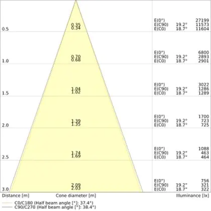 Der Abstrahlwinkel bezeichnet den Winkel, in dem das Licht aus der Lichtquelle ausgestrahlt wird. Er wird in Grad (D) angegeben. Je geringer die Gradzahl des Abstrahlwinkels ist, desto kleiner ist auch der Durchmesser des Lichtkegels, den die Lichtquelle produziert. Beispiel: Wird eine Lampe mit einem Abstrahlwinkel von 60 Grad an der Decke (2,5 m Höhe) angebracht, erzeugt sie einen Lichtkegel von 2,9 Metern Durchmesser. Hat die Lampe hingegen einen Abstrahlwinkel von 120 Grad, beträgt der Lichtkegel 8,7 Meter im Durchmesser. |
